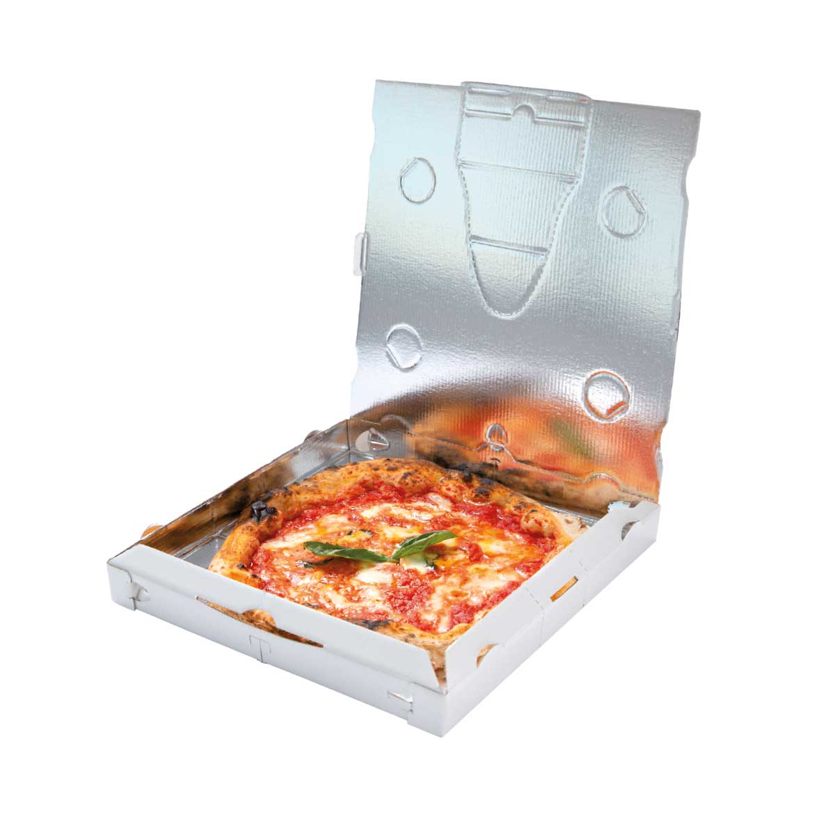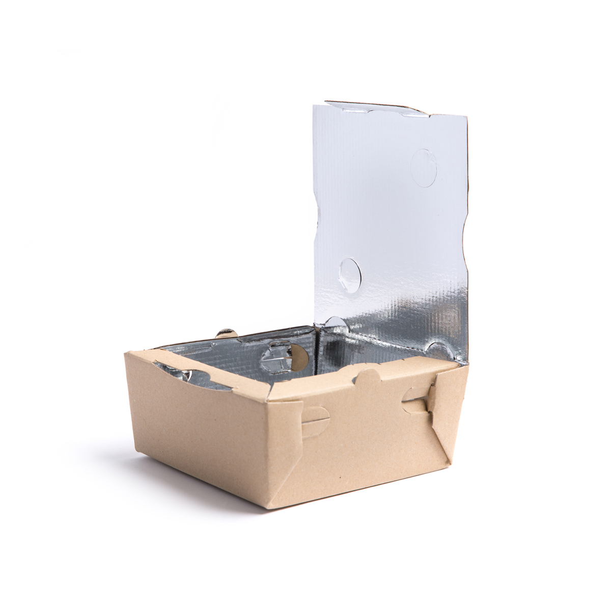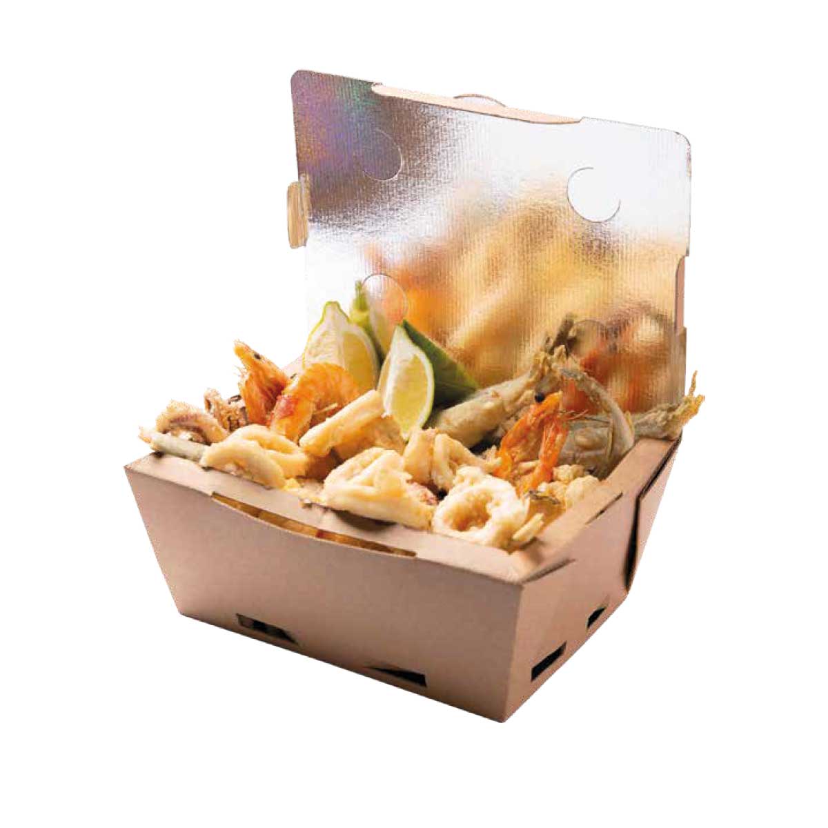 Per cibi caldi da asporto consigliamo le nostre confezioni in cartone con rivestimento in PLA (acido polilattico derivato dal mais), che offrono ottimo isolamento termico e resistenza all'umidità. Mantengono la temperatura per circa 30-40 minuti e non rilasciano sostanze nocive anche con alimenti grassi o acidi. Inoltre, a differenza dei contenitori in polistirolo, sono ecosostenibili e completamente riciclabili nella carta.