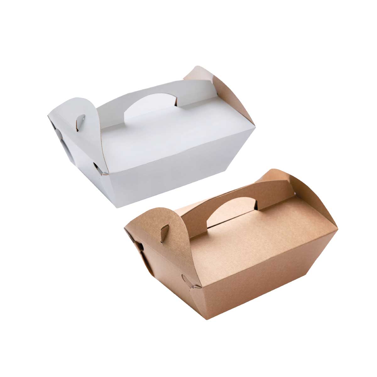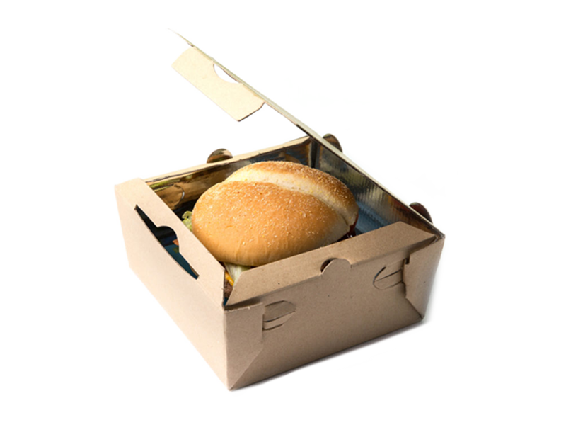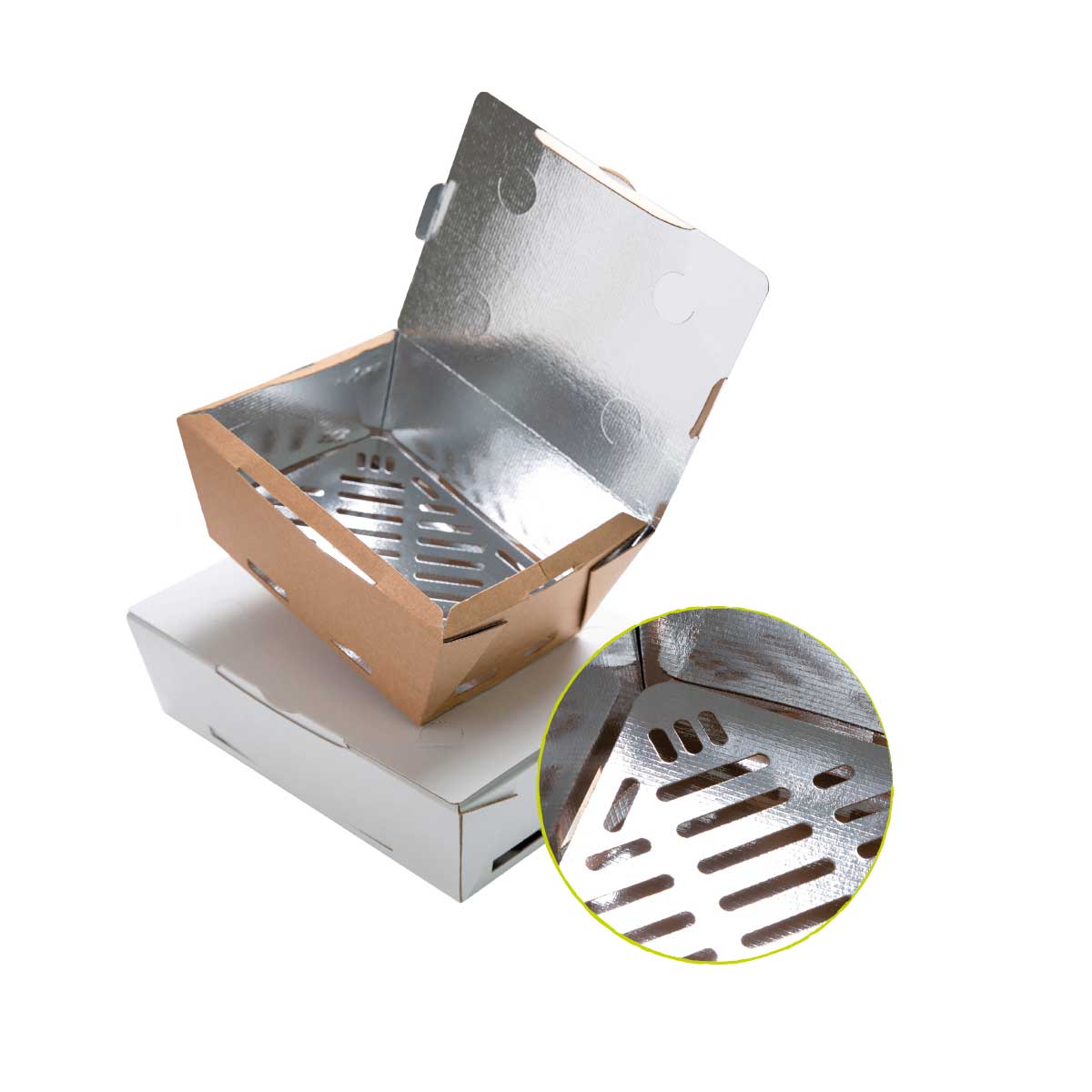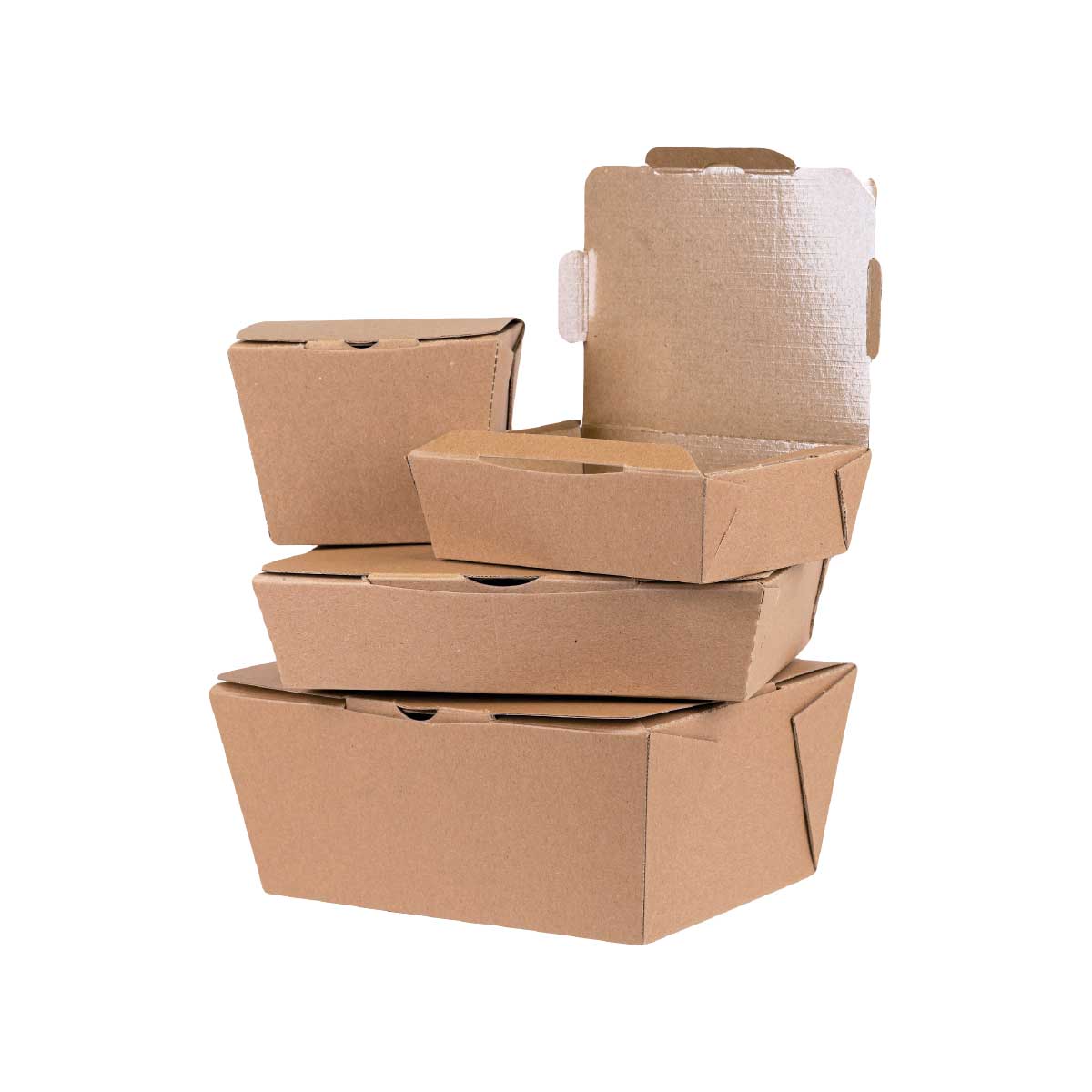 Per cibi caldi da asporto consigliamo le nostre confezioni in cartone con rivestimento in PLA (acido polilattico derivato dal mais), che offrono ottimo isolamento termico e resistenza all'umidità. Mantengono la temperatura per circa 30-40 minuti e non rilasciano sostanze nocive anche con alimenti grassi o acidi. Inoltre, a differenza dei contenitori in polistirolo, sono ecosostenibili e completamente riciclabili nella carta.